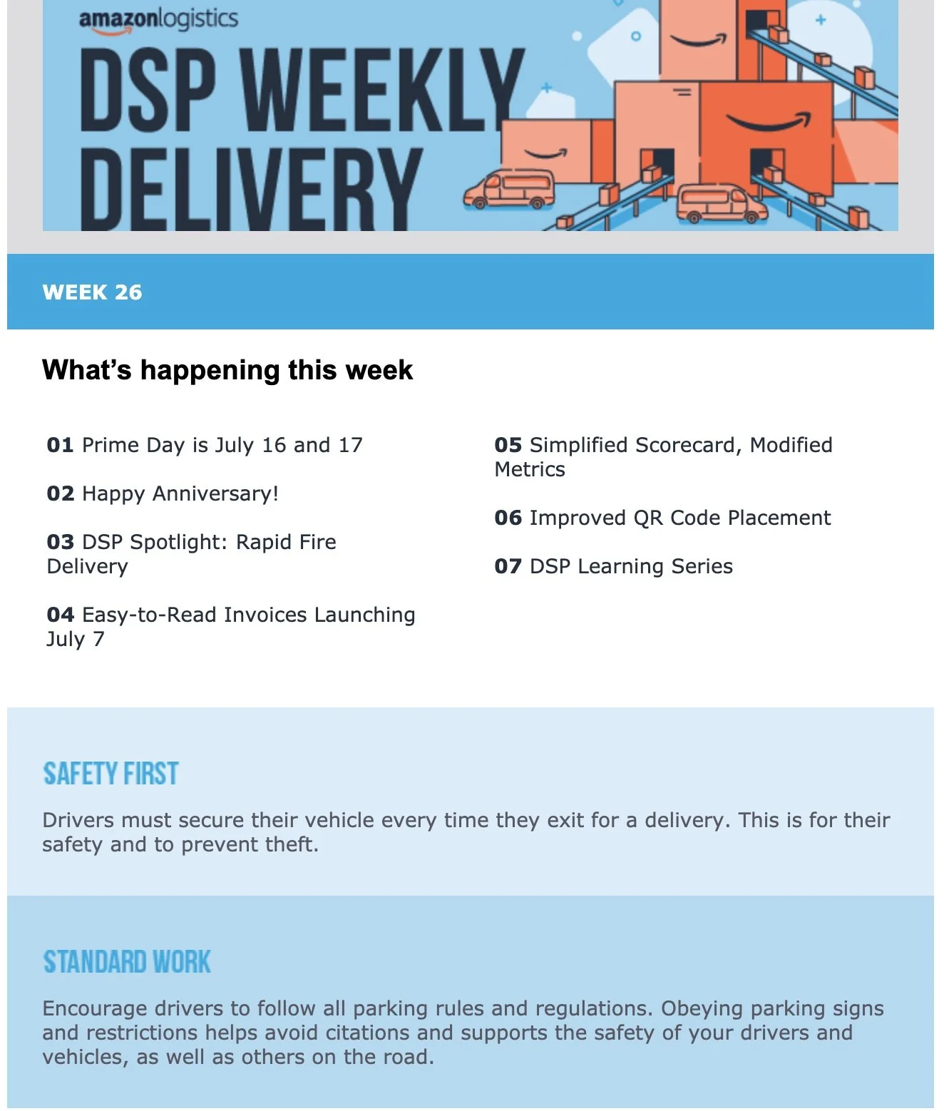 In my second role at Amazon I wrote, designed and managed a weekly newsletter that goes out to all Amazon “DSP” owners (the owners of the individual fleets of Prime delivery vans who have exclusive contracts with Amazon). This newsletter was the primary way hundreds of business owners got their updates from Amazon corporate.